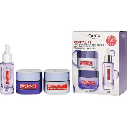 The L'Oréal Revitalift Filler [+ Hyaluronic Acid] Routine Set is your answer to a powerful anti-aging skincare solution. Consisting of three essential products: a Day Cream, a Night Cream, and an Eye Cream, this set is designed specifically for women who want to reclaim their youthful radiance. The formula harnesses the power of Hyaluronic Acid, an ingredient well-known for its incredible hydrating properties, ensuring your skin remains plump and nourished throughout the day and night. Buy this skincare set online to elevate your beauty regimen to the next level.