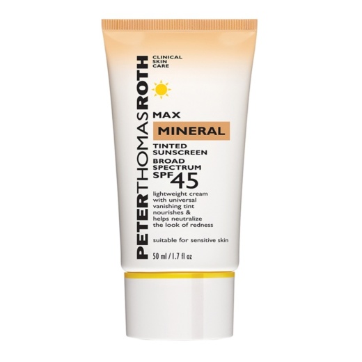 Peter Thomas Roth Clinical Skin Care Max Mineral Tinted Sunscreen Broad Spectrum SPF 45 is an all-mineral, tinted facial sunscreen with water-resistant, broad spectrum SPF 45 UVA/UVB sun protection. This water-resistant formula provides a medium to full coverage that evens skin tone while protecting against damaging UVA rays. Ideal for normal to oily or delicate complexions, it's formulated with Zinc Oxide and Titanium Dioxide to help prevent sunburns, minimize the appearance of fine lines and signs of aging and provide dry skin relief.